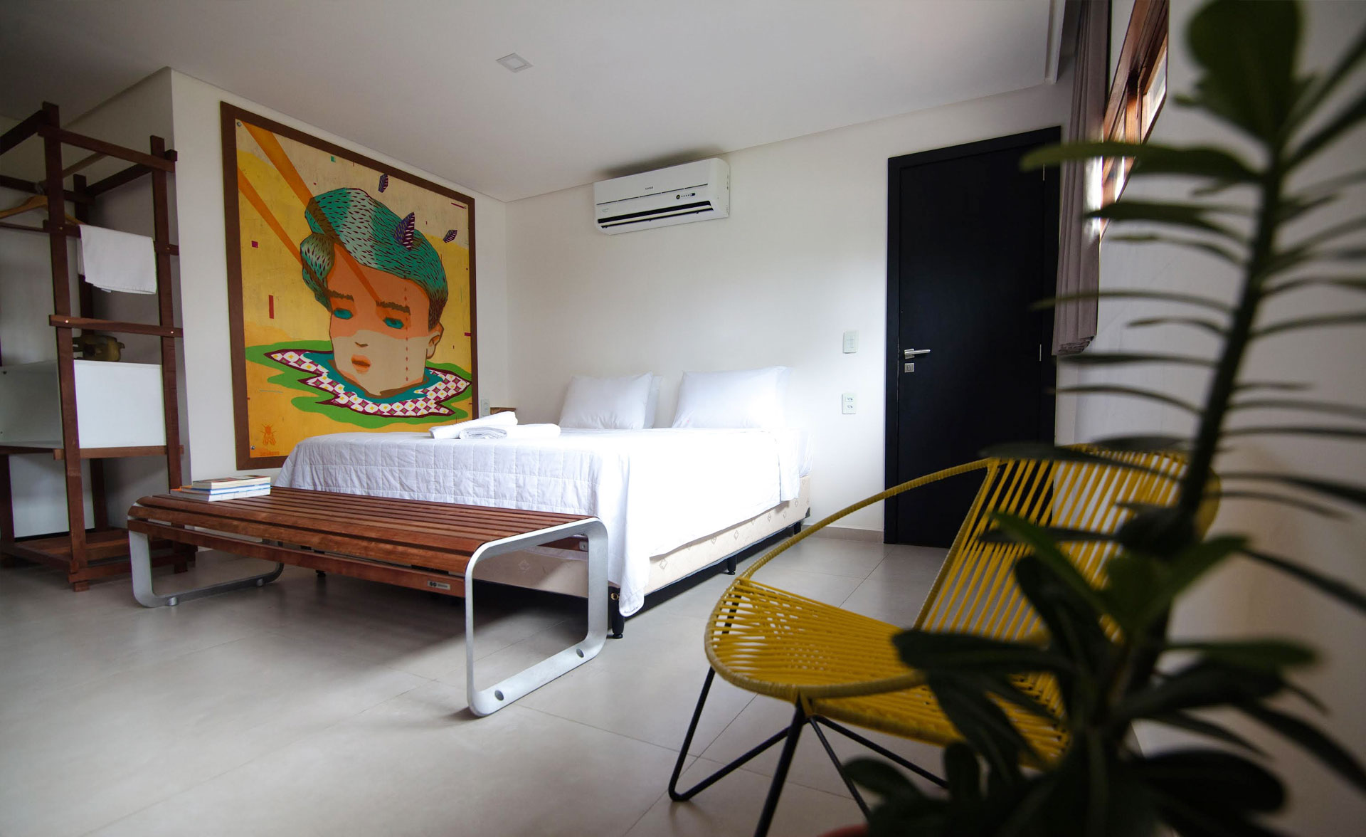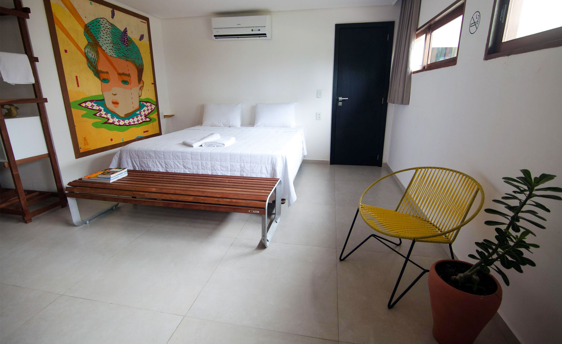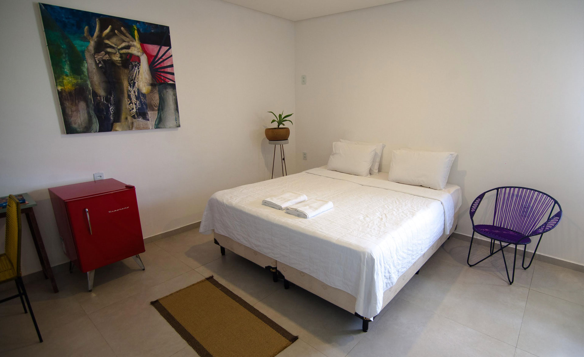 Suíte com espaço e conforto, cama com colchão de mola King Size, uma cadeira xilo e uma mesa taco, essa suíte tem banheiro duplo e espaço até pra esticar o tapete e praticar uma yoga logo cedo.
