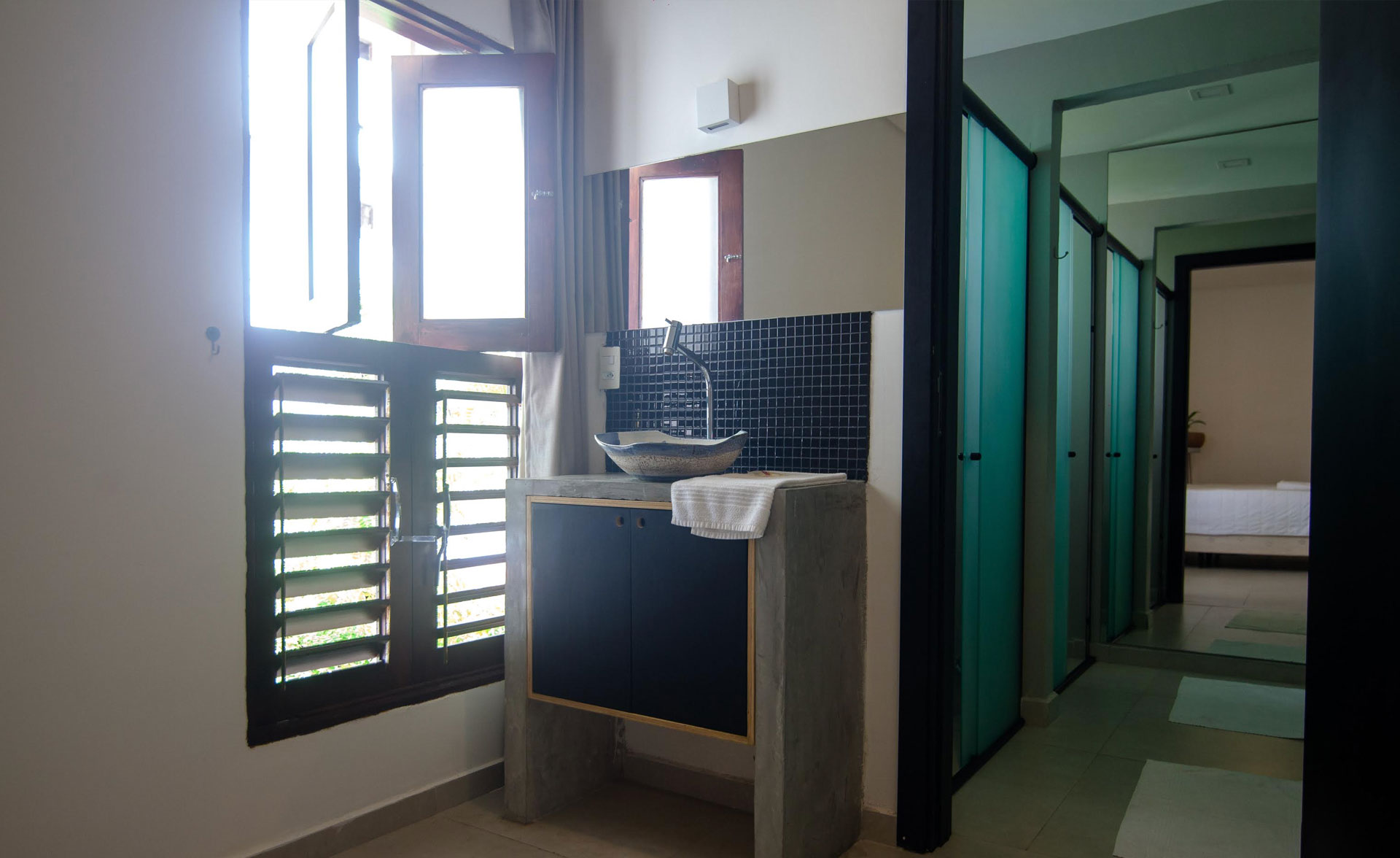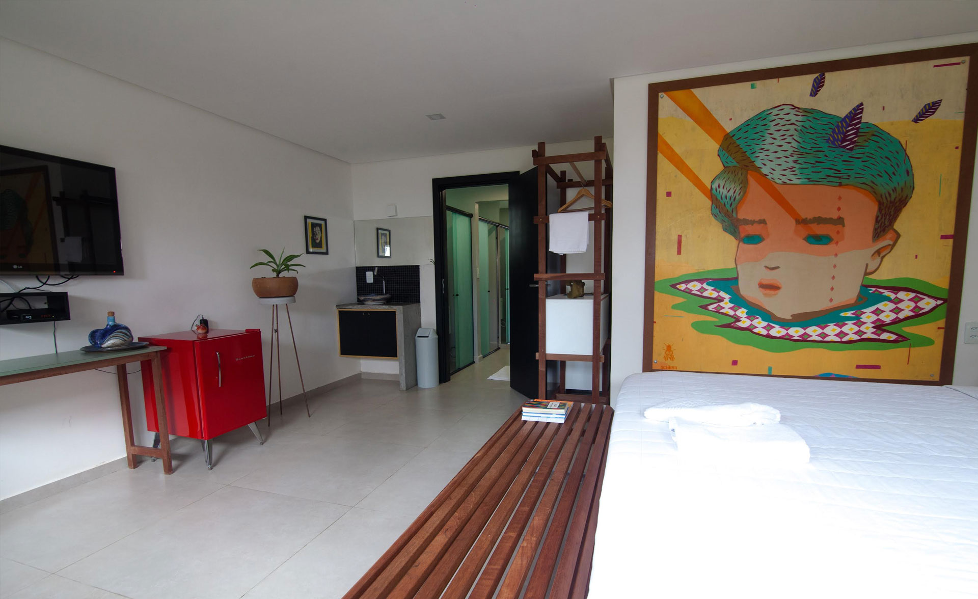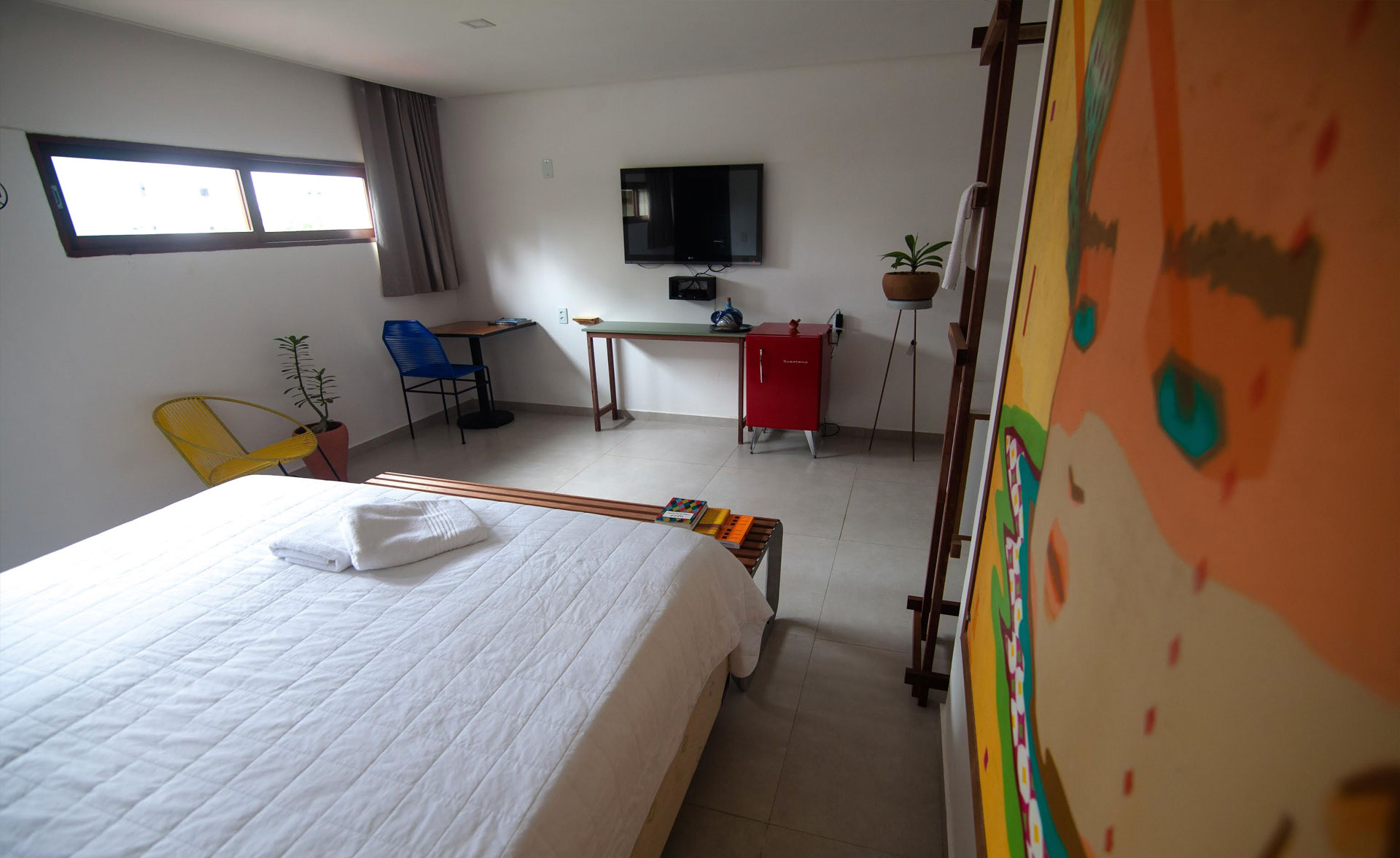Suíte com espaço e conforto, cama com colchão de mola King Size, uma cadeira xilo e uma mesa taco, essa suíte tem banheiro duplo e espaço até pra esticar o tapete e praticar uma yoga logo cedo.